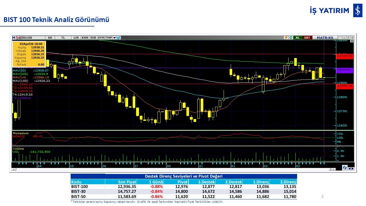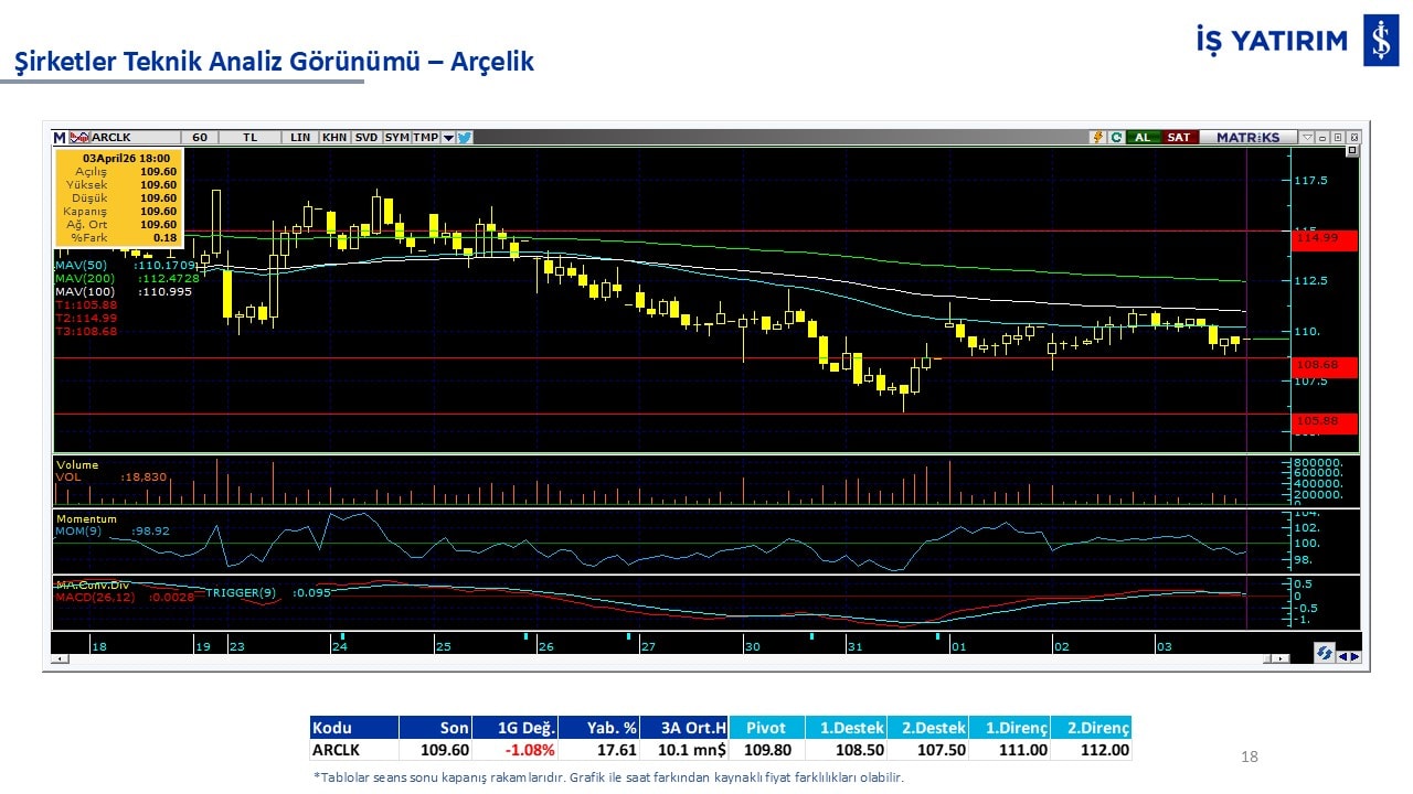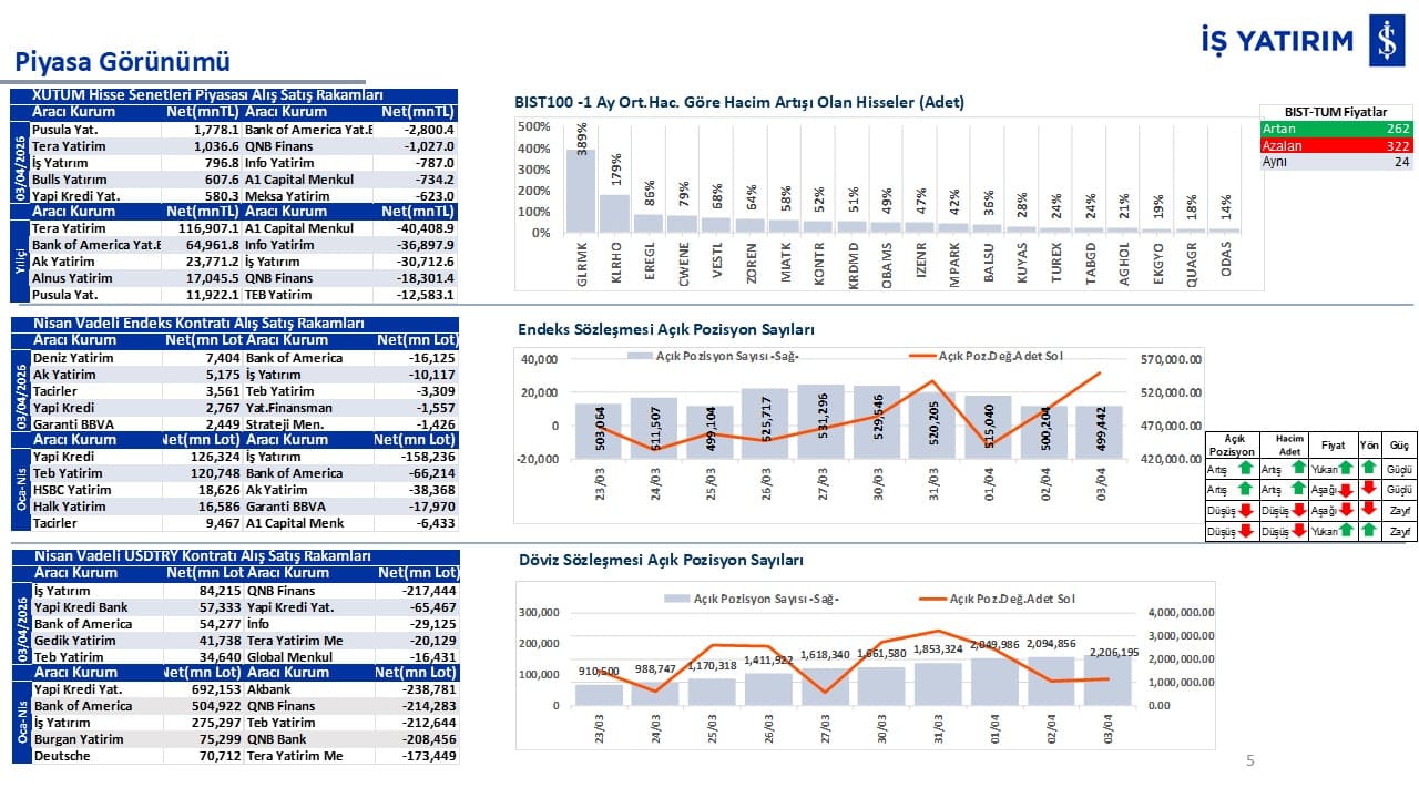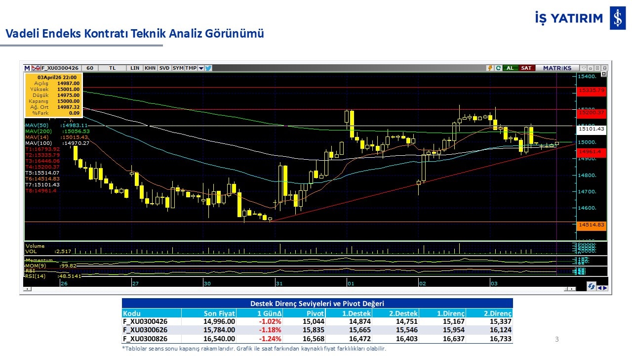 “Teknik Bülten” raporumuzun içeriğinde; Vadeli endeks, kur, BIST100 endeksi, temel analiz tarafında da öneri verdiğimiz 18 adet hissenin teknik destek/direnç seviyeleri ve buna baz teşkil eden teknik grafikleri, bugün piyasadan pozitif ayrışma ihtimali olan hisseler ve bunların teknik destek/direnç seviyeleri, piyasa rakamları, dün çok açığa satış yapılan hisse senetleri ve kısa vadeli işlem önerilerimizden son 10 tanesi yer almaktadır.