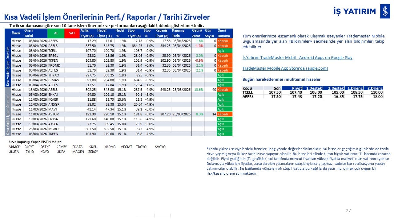 Kısa vadeli işlemlerimizin performanslarını ve tarihi zirve kapanışı yapan BIST hisselerini raporun son bölümünde görüntüleyebilirsiniz.